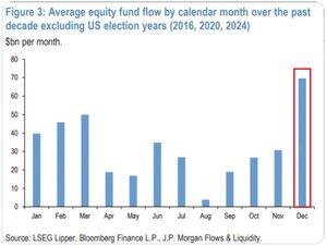 ¿Se está posicionando el mercado para un repunte de fin de año? Las entradas de fondos de renta variable estadounidenses han promediado +70.000 millones de dólares en diciembre durante los últimos 10 años, excluyendo los años electorales, la cifra más alta de cualquier mes. Esto es más del doble de la media vista en octubre y noviembre. Si esta tendencia se mantiene, los fondos de renta variable están listos para una de las mayores entradas netas registradas el próximo mes. El repunte histórico probablemente será impulsado por inversores minoristas. Esto ocurre mientras las entradas netas minoristas en ETFs de renta variable alcanzaron los +160.000 millones de dólares en septiembre y octubre, el total más alto en dos meses desde el aumento postelectoral entre noviembre y diciembre de 2024, según JPMorgan. La configuración de la "reunión de Papá Noel" parece cada vez más probable.