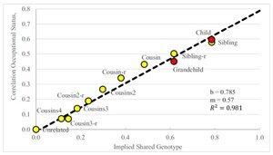Empecemos por lo primero: las correlaciones entre padres, hijos y hermanos en las medidas de estatus son idénticas—¡difícil de explicar culturalmente!