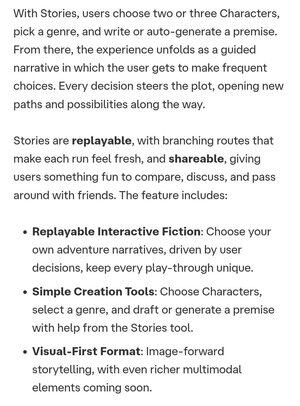 Character AI está lanzando un nuevo formato llamado 'Historias'. Los usuarios navegarán por una narrativa visual/textual guiada por IA y tomarán decisiones en cada intercambio a medida que avanza la historia. La semilla de la historia puede ser escrita por el usuario o generada por IA. Se planifican características multimodales adicionales.