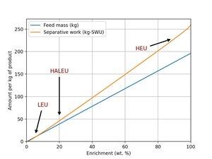 Así es cuánto trabajo separativo y alimentación necesitas para un kg de uranio enriquecido en varios enriquecimientos. Ambas relaciones son casi lineales, por lo que un kg de 20% de HALEU requiere aproximadamente 4 veces más uranio de alimentación y 4 veces más SWU que un kg de LEU. Incluso sin un extra de HALEU, necesitarías un consumo 4 veces mayor en tu reactor alimentado por HALEU para equilibrar los costes de combustible con un reactor LEU más eficiente neutronicamente (asumiendo masa constante del núcleo).