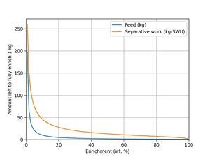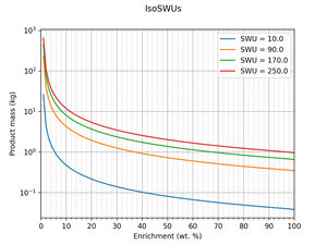 Y uno divertido: ¡IsoSWUs! Estas líneas muestran cuánta cantidad de uranio en diferentes enriquecimientos se podría obtener con una cantidad determinada de trabajo separado (SWU).