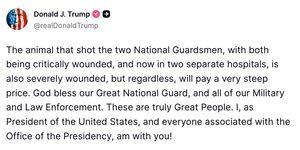 NUEVO: El presidente Trump dice que el "animal" que disparó a dos soldados de la Guardia Nacional "pagará un precio muy alto."