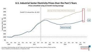Los precios de la electricidad industrial en EE. UU., en los 5 estados con más centros de datos, han subido un +43% en los últimos 5 años.