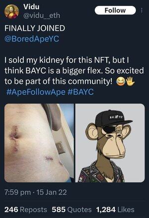 En 2022 vidu__eth vendió su riñón para comprar Bored Ape alrededor de 100ETH+($400K+), y luego dejó el cripto en 2024 tras una caída a 10th