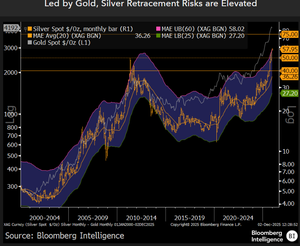 Los largos plateados suelen sufrir los niveles actuales - La última vez que la plata se estiró a una prima similar a la actual frente a su media móvil de 20 meses fue en el máximo de 2020, cerca de 30 dólares la onza. El mínimo fue de 17,56 dólares en 2022, marcando la base de la tendencia alcista actual. Mi gráfico destaca el mercado alcista prolongado del metal y lo desfavorables que suelen ser estos niveles para posiciones largas. Informe completo sobre Bloomberg aquí: {BI COMD} #silver #gold #metals #technicalanalysis @BBGIntelligence