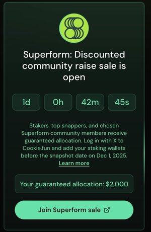 Justificación de la inversión de VanEck para participar en la venta de Superform Participamos en la venta @superformxyz que actualmente está en venta en Cookie x Legion. Las razones de mi participación en la venta son las siguientes: 1. Buenas condiciones de VAD en comparación con el tamaño de la inversión Superform ha recibido una inversión de 10 millones de Van Eck, una de las casas de mayor nivel en finanzas tradicionales en Estados Unidos. Aun así, los términos de esta venta son decentes, con 90 millones de dólares FDV. 2. Asignación fija de Cookie Ranker (asignación coreana) Estoy clasificado en octavo puesto en Superform Cookie Snapping en Capital Mindshare Corea. Por lo tanto, puedo recibir una asignación confirmada de 2000$ y planeo participar en más de la asignación confirmada. 3. TGE está a la vuelta de la esquina, 100% desbloqueado en TGE Se espera que el TGE de Superform sea el 23 de diciembre, y las condiciones están 100% desbloqueadas en el momento del TGE, por lo que el dinero estará atado durante un corto periodo de tiempo. 4. Extrañamente impopular Aunque el mismo impulso de inversión de 10 millones registró una enorme sobresuscripción, la venta de Superform representó menos de la mitad. Parece tener un gran impacto en las condiciones del mercado... De hecho, pensé que podía hacer más que el evento principal, así que pensé que era una oportunidad. Como he recibido una asignación confirmada por snapping, siento que no puedo comer esto. Van Eck cree.