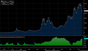 En segundo lugar, Bitcoin está actualmente impulsado por los cambios en los tipos de interés reales. Incluso si la Fed rebaja los tipos, la cuestión es cómo está esta entrada generando liquidez EN NET. El gráfico siguiente muestra los tipos de interés reales a 2 años invertidos con BTC sobrepuesto. Fíjate que los cambios en los tipos reales se mueven al mismo ritmo que BTC.