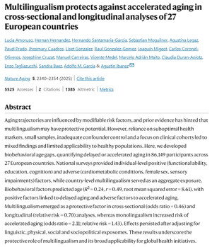 Toisen kielen oppiminen voi suojata kognitiiviselta heikkenemiseltä. 86 000 ihmisen tiedot 27 maasta: Monikielisyys ennusti 30 % pienemmän riskin kiihtyneelle biologiselle ikääntymiselle ajan myötä. Useilla kielillä kommunikointi on eräänlaista henkistä harjoitusta.