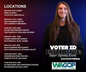 Scott Presler va promouvoir l'INITIATIVE D'IDENTIFICATION DES ÉLECTEURS à travers l'État de Washington avec des événements de Super Signature à Marysville, Grays Harbor, Benton County, Yakima, Spokane et King County, du 16 au 20 novembre. Ne manquez pas cette opportunité unique dans une vie. @ScottPresler @KCGOP @JimWalshLD19 @WAGOP @AAGDhillon @gop_yakima