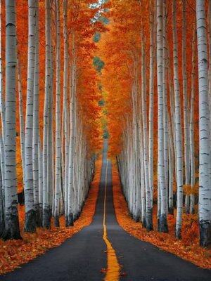 La nature a un art magnifique. Le tunnel enflammé de la nature : Des bouleaux d'automne vibrants s'arc-boutent au-dessus d'une route pittoresque dans le canyon de Bishop Creek, Californie !