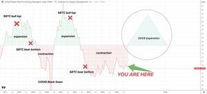 Si le cycle économique américain (ISM PMI) entre en territoire d'expansion en 2026 comme illustré ci-dessous, le $BTC atteindra enfin le sommet de son cycle de marché haussier actuel 🤝
