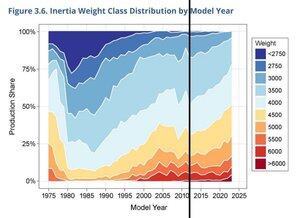 En réalité - Les ventes de grandes voitures (>4 000 lbs) étaient en DÉCLIN, passant de 58 % des véhicules à 47 % au cours de la décennie précédente. Après le changement des normes, elles ont augmenté chaque année pour atteindre 75 %, même si les prix de l'essence ont augmenté.