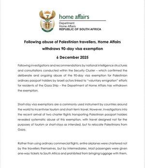 DERNIÈRE MINUTE : L'Afrique du Sud a annoncé l'annulation des exemptions de visa pour les Palestiniens.