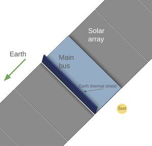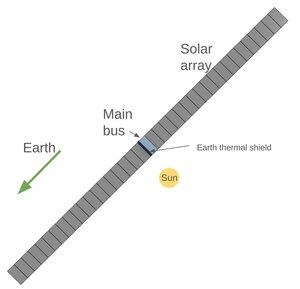 Un satellite Starlink dans cette orbite a plein soleil, donc l'arrière est toujours à l'ombre et relativement frais. La chose la plus chaude dans le ciel est la Terre, occupant presque la moitié du ciel en bas à gauche sur ces images. Donc, mettez également un réflecteur de chaleur MLI là-bas, et ensuite à l'arrière du bus principal, nous pouvons utiliser le rayonnement passif pour refroidir. Les parties non brillantes de l'espace sont très froides. Un ensemble de cette taille produit environ 130 kW d'énergie électrique.