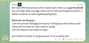 Annonce aux membres concernant le seuil StandX @StandX_Official Actuellement, le seuil StandX est élevé, ce qui a conduit de nombreuses personnes à contacter les membres du groupe StandX Kaito Creators. Il semblerait qu'un membre de l'équipe ait directement demandé à Kaito hier et ait reçu la réponse officielle suivante : ▶ Ce qui a été confirmé par l'équipe Kaito, c'est qu'il existe un seuil, mais qu'il n'est pas aussi élevé que prévu. ▶ Cela vise à inciter les utilisateurs à être un peu plus actifs pour de meilleures récompenses, tout en étant un dispositif pour bloquer les bots. ▶ Ce que nous pouvons faire - Utiliser le message épinglé dans le groupe pour rédiger des publications. - Partager le lien des publications dans le chat pour augmenter la visibilité. - Encourager les membres à interagir pour accroître leur influence. D'après ce que je sais, le seuil Yap est de 100, et ce que nous devons faire maintenant, c'est de rédiger régulièrement des publications liées à StandX pour obtenir des Yap et participer activement aux interactions avec les utilisateurs globaux dans le canal du groupe. Aujourd'hui encore, nous allons continuer cette interaction infinie. Nous devons absolument respecter le classement !