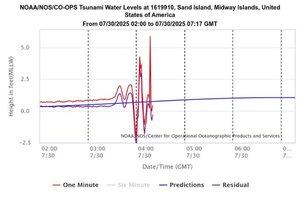 Gelombang hingga 7 kaki sekarang diamati di Midway, setengah jalan ke Hawaii.