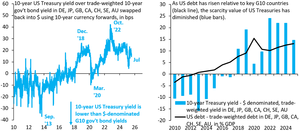 AS kehilangan hak istimewanya yang selangit satu dekade lalu, ketika imbal hasil Treasury 10-tahun naik di atas imbal hasil dalam mata uang $ di sisa G10 (lhs). Alasan yang paling mungkin adalah karena akumulasi utang AS jauh lebih cepat (rhs, garis hitam). AS bermain dengan api...