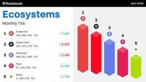 🚨5 EKOSISTEM TERATAS BERDASARKAN TRANSAKSI BULANAN – Dua mingguan Juli 2025 Apa yang kita lihat adalah pergeseran dinamis dalam penggunaan tingkat ekosistem. ▫️ Longsoran salju → 530 juta txs (+7,45%) ▫️ Superchain → 401 juta txs (–4,07%) ▫️ Ethereum → 400 juta txs (–1,44%) ▫️ Flare → 27,6 juta txs (+6,43%) ▫️ Boba → 1.5 juta txs (+1.72%) Jika Anda memetakan lanskap multichain, perubahan ini membantu menampilkan tempat pengguna benar-benar terlibat.