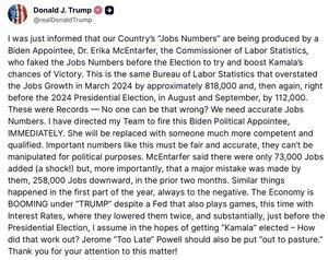 Setelah Biro Statistik Tenaga Kerja AS mengumumkan sebelumnya hari ini pertumbuhan pekerjaan yang mengecewakan untuk bulan Juli, naik hampir 73.000, sementara juga mengumumkan revisi besar untuk angka pertumbuhan pekerjaan pada bulan Mei dan Juni, dengan angka yang direvisi turun oleh gabungan 250.000. Presiden Trump telah mengumumkan melalui sebuah posting di Truth Social, bahwa dia telah memerintahkan pemecatan Dr. Erika McEntarfer, Komisaris Statistik Tenaga Kerja yang ditunjuk oleh Presiden Biden, mengklaim bahwa dia "memalsukan Angka Pekerjaan sebelum Pemilu untuk mencoba dan meningkatkan peluang Kamala untuk Menang." Selain itu, Presiden Trump menyatakan bahwa Ketua Federal Reserve Jerome Powell, "juga harus ditempatkan "di padang rumput."