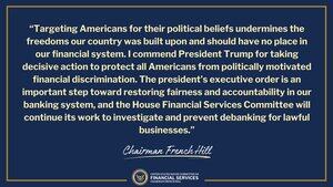 BARU: Ketua @RepFrenchHill memuji @POTUS karena mengeluarkan perintah eksekutif untuk melindungi semua orang Amerika dari diskriminasi keuangan bermotif politik.