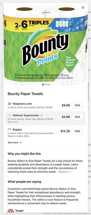 Menemukan harga terbaik, menyoroti mengapa Anda mungkin menyukai barang tersebut (sudut pandang yang baik untuk menggunakan konteks pribadi), dan ringkasan ulasan dari berbagai sumber