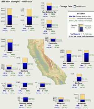 Penyimpanan air California dalam kondisi luar biasa pada 115% dari normal di seluruh negara bagian, dengan waduk menampung hampir 6 triliun galon air.