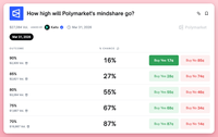 Sentimen lemah, tetapi pasar prediksi mengambil alih papan peringkat Kaito. Polymarket dan Kalshi berada dalam perang afiliasi, keduanya memasukkan lebih banyak CT KOL dan pedagang ke jaringan mereka. Polymarket selangkah lebih maju dengan bekerja sama dengan @KaitoAI untuk meluncurkan pasar prediksi di Mindshare, yang dapat menarik banyak orang. Pasar menyelesaikan "Ya" jika Polymarket mencapai target mindshare harian kapan saja antara 20 November dan 31 Maret 2026. Jika tidak, itu akan menyelesaikan "Tidak." Pangsa pikir Polymarket mendekati 50% sekarang. Kemungkinan 70% mindshare adalah 87%.