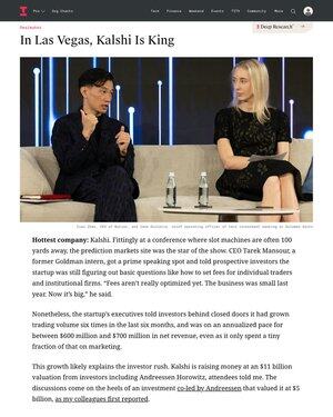 "Di Las Vegas, Kalshi Adalah Raja" - @theinformation @Kalshi telah menyalip perusahaan AI untuk menjadi startup terpanas di Silicon Valley di konferensi teknologi unggulan Goldman Sachs. Investor memperebutkan alokasi di OpenAI, Cursor, dan Kalshi di acara eksklusif di mana "situs pasar prediksi adalah bintang pertunjukan". Tempat berbicara utama tahun ini? Bukan Jensen. Tidak @sama... Tapi Kalshi @mansourtarek_. Sementara AI menjadi perdagangan teknologi yang paling ramai, monster berikutnya diam-diam muncul dari kategori yang sama sekali berbeda: penetapan harga peristiwa dunia nyata.