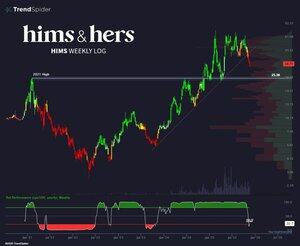 Support garis tren multi-tahun menembus grafik $HIMS. Tertinggi 2021 adalah level referensi utama berikutnya.
