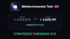 🟢 BERITA SΞR: Bitmine $BMNR menambahkan 69.822 ETH (~$200 juta) minggu lalu, sehingga total cadangan mereka menjadi 3.629.701 ETH.