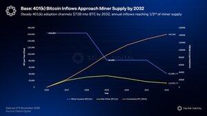 Perkiraan kasus dasar menunjukkan bahwa bahkan alokasi di bawah 1% ke Bitcoin dapat diterjemahkan menjadi sekitar $80 miliar dalam permintaan bersih pada tahun 2032. Skenario agresif menempatkan angka itu mendekati $ 195 miliar.