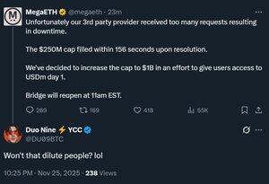 Batas @megaeth $250 juta tercapai di bawah 2 menit. Untuk mengimbanginya, Mega menaikkan batas menjadi $1 miliar. Masalahnya adalah bahwa deposan awal mencairkan 4x tanpa kemungkinan untuk menarik dan mereka juga tidak diberitahu tentang kemungkinan ini. Karpet yang bagus. $500 juta sudah disetorkan.