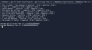 Menjalankan tes cepat yang membandingkan klasifikasi (positif/negatif) menggunakan gpt-3.5-turbo, dan membandingkan kesamaan dengan penyematan positif dan negatif (saya menggunakan scapy di sini).