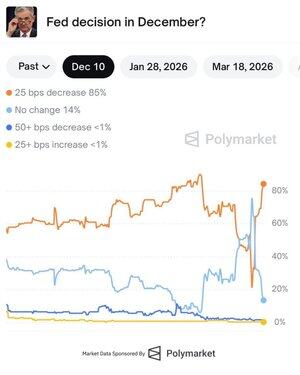 Pengguna Polymarket memprediksi kemungkinan 85% penurunan suku bunga Desember. Sebuah pompa bisa saja sedang dalam perjalanan.