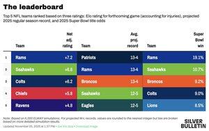 Pembaruan ELWAY! Untuk pertama kalinya sepanjang tahun, benar-benar #1 yang jelas dalam peluang Super Bowl, Rams, meskipun itu masih berarti hanya 19%.
