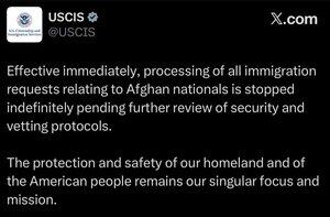 Layanan Kewarganegaraan dan Imigrasi AS (USCIS) telah mengumumkan bahwa mereka segera menangguhkan semua permintaan imigrasi yang terkait dengan warga negara Afghanistan, menyusul serangan yang ditargetkan hari ini oleh seorang warga Afghanistan terhadap anggota Garda Nasional di Washington, DC.