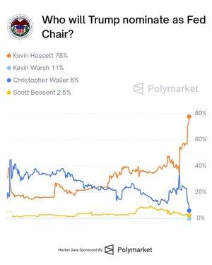 JUST IN: Kevin Hasset yang ramah kripto sekarang memiliki peluang 78% untuk dinominasikan sebagai Ketua Fed berikutnya, menurut Polymarket 👀 🇺🇸