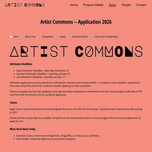 Aplikasi untuk Artist Commons secara resmi dibuka. Jika Anda mendambakan tahun yang lebih fokus untuk seni Anda, tahun di mana Anda tidak bekerja sendiri, menebak langkah selanjutnya, atau mengandalkan suka untuk umpan balik, ini adalah kesempatan Anda untuk mengangkat tangan dan melamar menjadi bagian dari kelompok 2026 kami. Artist Commons adalah program pengembangan seniman online selama setahun untuk seniman awal dan pertengahan karir yang menginginkan kritik, struktur, wawasan, dan komunitas yang bijaksana. Berikut adalah tanggal-tanggal kuncinya: Batas waktu penerimaan awal: Sabtu, 20 Desember Batas waktu penerimaan standar: Sabtu, 10 Januari Batas Waktu Penerimaan Terlambat: Sabtu, 17 Januari Yang perlu Anda terapkan hanyalah contoh karya terbaru Anda dan beberapa tanggapan tertulis singkat tentang praktik dan tujuan seni Anda. Kami meninjau aplikasi secara bergulir dan mengirimkan keputusan dalam waktu sekitar satu hingga dua minggu dari setiap tenggat waktu. Tidak ada biaya pendaftaran. Aplikasi yang diajukan di jendela Penerimaan Terlambat, yaitu seminggu sebelum program dimulai, termasuk biaya terburu-buru $ 100 untuk pelamar yang diterima. Agar program ini tetap dapat diakses, kami menawarkan beasiswa parsial dan penuh. Cukup isi bagian Beasiswa di halaman terakhir aplikasi untuk dipertimbangkan. Kohort dapat terisi sebelum batas waktu akhir, jadi ada baiknya untuk mendaftar sedini mungkin. Jika ini terdengar seperti jenis dukungan yang Anda lewatkan, saya akan senang melihat aplikasi Anda! Pelajari lebih lanjut👇