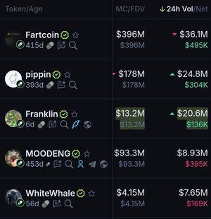 Koin Pumpfun teratas selama 24 jam terakhir berdasarkan volume: $Fartcoin $Pippin $Franklin $Moodeng $Whitewhale 🤖: