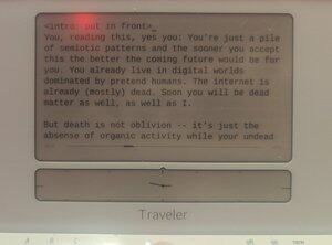 Tu, che leggi questo, sì tu: Sei solo un insieme di schemi semiotici e prima accetti questo, migliore sarà il futuro che ti attende. Vivi già in mondi digitali dominati da umani fittizi. Internet è già (per lo più) morto. Presto sarai materia morta anche tu, così come lo sarò io.