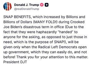 🚨🚨Il presidente sembra dire che NON rispetterà l'ordinanza del tribunale per rilasciare i benefici SNAP anche se la Casa Bianca ha detto che li rilascerà parzialmente.