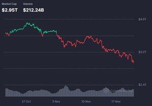 ULTIME NOTIZIE: La capitalizzazione totale del mercato delle criptovalute è diminuita di circa il 25 percento, scivolando da 3,92T del 27 ottobre a 2,92T attualmente.