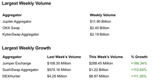 Sul fronte degli aggregatori, @Jupiter continua a guidare il gruppo in termini di volume settimanale, con @okx che si fa strada nella fascia alta e @KyberNetwork subito dietro.