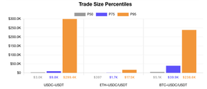 Le percentuali delle dimensioni delle operazioni sono scese bruscamente su tutte le coppie questa settimana. I P95 delle stablecoin sono scesi da circa 2,5 milioni di dollari a 300.000 dollari, e sia BTC che ETH hanno registrato un calo di circa il 50 percento. Questo segnala un chiaro ritiro dalle operazioni più grandi e un passaggio verso flussi più piccoli. I trader unici settimanali sono stati 1.600.