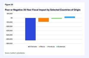 "Gli immigrati più gravosi dal punto di vista fiscale sono i salvadoregni, che aumentano il debito nazionale di oltre $50.000 in 30 anni, seguiti dal gruppo di immigrati più numeroso, i messicani, che, in media, aumentano il debito nazionale di $10.000 ciascuno in 30 anni."