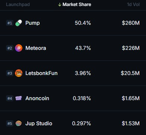 Le prime 5 piattaforme di lancio di memecoin per quota di mercato: PumpFun — 50,4% Meteora DBC — 43,7% LetsBonkFun — 3,96% Anoncoin — 0,318% Jup Studio — 0,297%