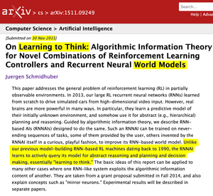 [1] J. Schmidhuber (JS, 2015). Sull'apprendimento a pensare: Teoria dell'informazione algoritmica per combinazioni nuove di controllori RL e modelli neurali ricorrenti del mondo. ArXiv 1210.0118