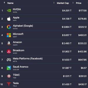 Le 10 azioni più grandi al mondo valgono ora un totale di 26,52 trilioni di dollari, rispetto ai 25,35 trilioni della settimana scorsa.