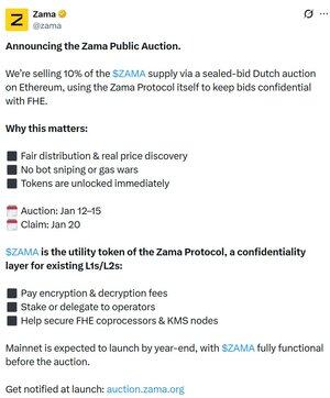 【Zama terrà un'asta olandese dal 12 al 15 gennaio, con l'intenzione di vendere il 10% dell'offerta di ZAMA】 Un altro progetto sta per avviare un ICO, chi è interessato a partecipare continui a seguire🧐 La società di crittografia FHE @zama ha annunciato che venderà il 10% dell'offerta del suo token ZAMA tramite un'asta olandese su Ethereum, che si svolgerà dal 12 al 15 gennaio, con inizio della distribuzione il 20 gennaio. L'asta utilizza il protocollo Zama per mantenere la riservatezza delle offerte, con l'obiettivo di garantire una distribuzione equa e una vera scoperta dei prezzi, evitando l'acquisto da parte di bot e le guerre sui costi del Gas, e i token saranno sbloccati immediatamente al termine dell'asta. ZAMA è il token pubblico del protocollo Zama, principalmente utilizzato per pagare le spese di crittografia e decrittografia, può essere messo in staking o delegato agli operatori e aiuta a proteggere i processori FHE e i nodi KMS. Si prevede che la mainnet di Zama venga lanciata entro la fine dell'anno, e ZAMA sarà completamente disponibile prima dell'asta.