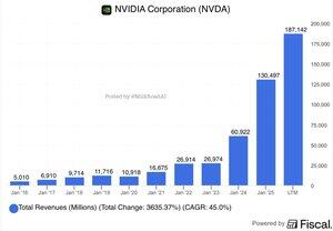 Ora guarda il grafico attraverso questa lente. Le entrate di Nvidia salgono da circa 5 miliardi nel 2016 a circa 187 miliardi negli ultimi dodici mesi, quindi l'azienda è già passata da grande azienda di chip a stampante di denaro AI prima che quel pipeline di mezzo trilione si presenti completamente.